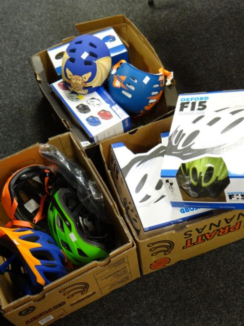 Three boxes of various as new childrens & adults cycle helmets (some Oxford)