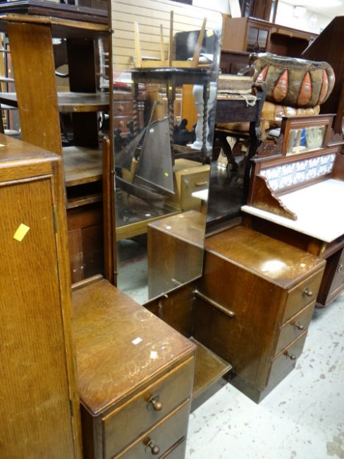 A vintage oak bedroom suite comprising two-door wardrobe, mirrored dressing table & a gentleman's wardrobe