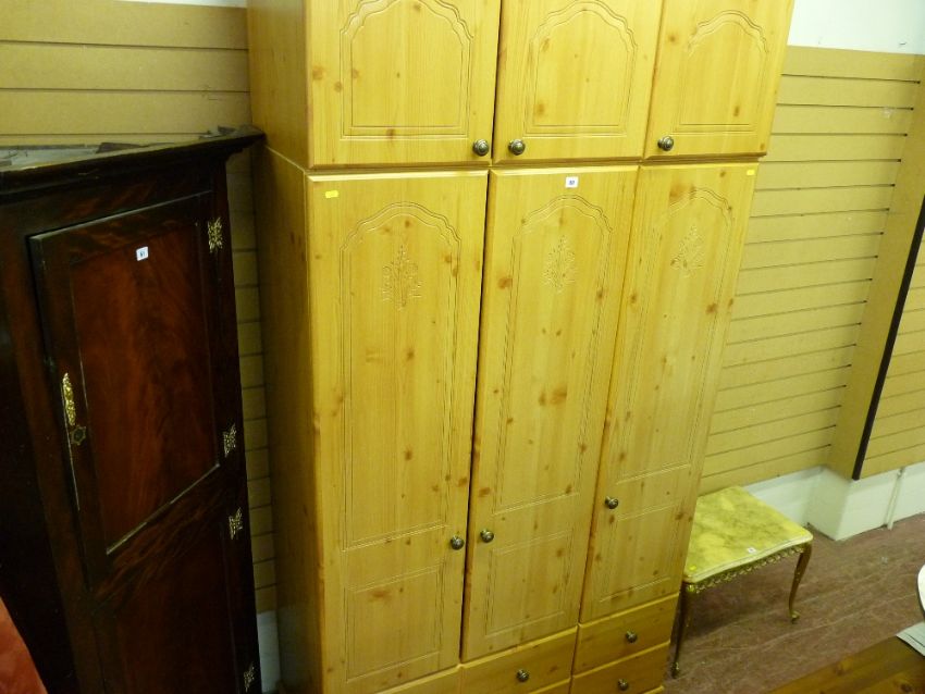 Excellent modern light wood effect three door wardrobe with base drawers and upper cupboard compartment