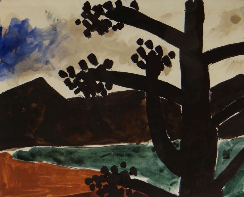 JOSEF HERMAN RA mixed media - tree in landscape, entitled verso 'Tree I', signed verso, 19 x 24cms