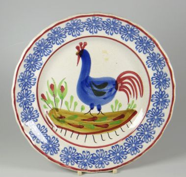 A LLANELLY POTTERY COCKEREL PLATE typically decorated with light-blue sponged rosette motifs to the border, 24.5cms diam