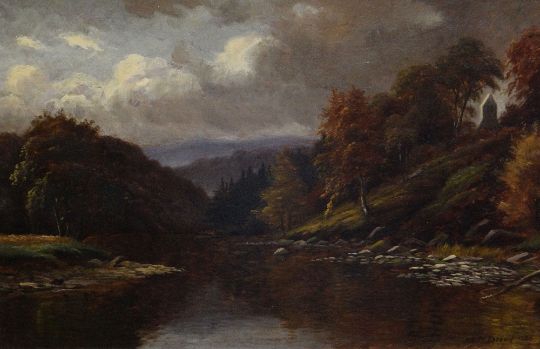 SYDNEY BROAD oil on canvas - river with church near bank, signed, 34 x 51cms