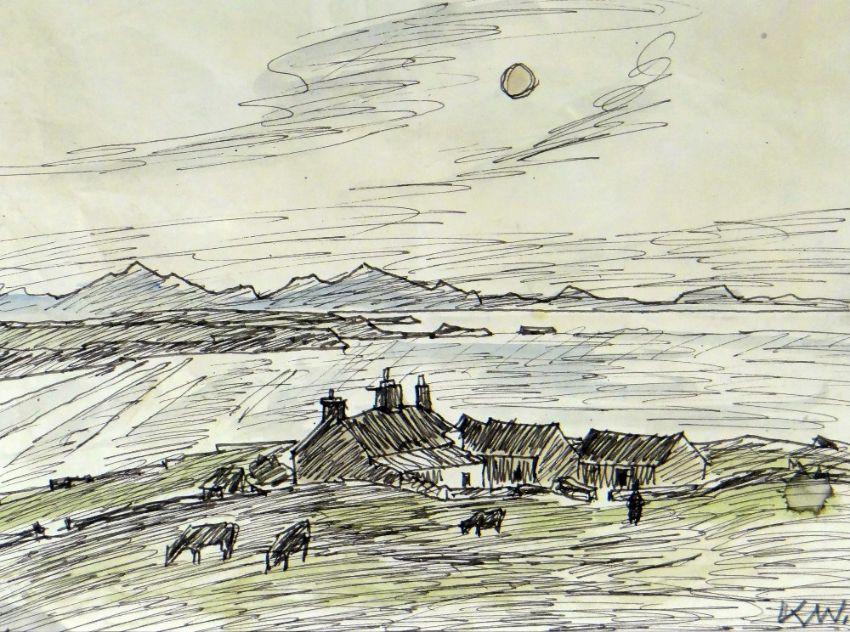 SIR KYFFIN WILLIAMS RA pen & wash - study of North Wales mountainous landscape with farm cattle & farmer in foreground depicting Penrhyn Du, signed initials lower right, 20 x 27cms