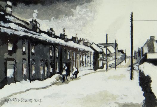 HOWELL DAVIES acrylic - South Wales street scene under snow entitled 'Winter Ogmore Vale' to reverse, signed & dated 2017, 14 x 21cms