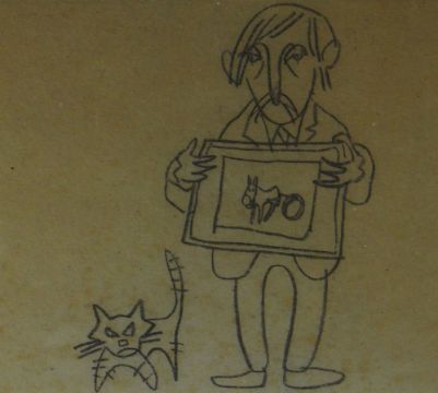 SIR KYFFIN WILLIAMS RA pencil on brown paper - self-portrait caricature holding a drawing and with cat on the floor, Albany Gallery label verso, 22 x 25cms