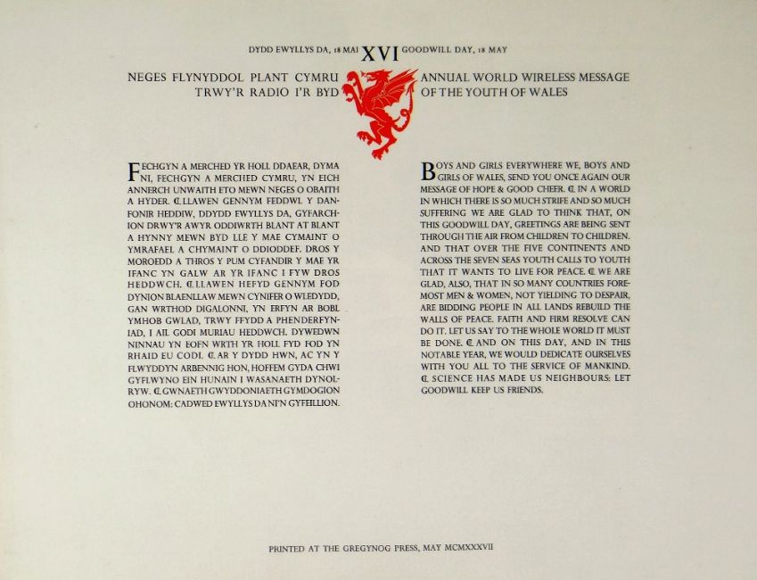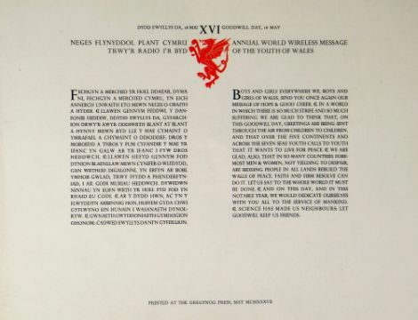 GREGYNOG PRESS a framed bilingual text - Annual World Wildest Message of the Youth of Wales poster, 1987, 28 x 37cms