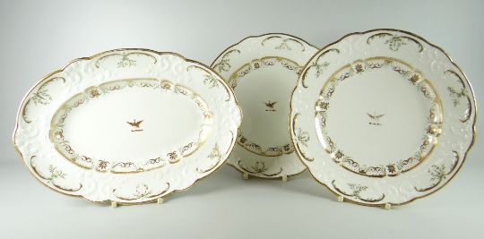 A SWANSEA PORCELAIN PART DESSERT SET from the Venn service with centred family crest, comprising matching oval dish and a pair of circular plates, decorated with foliate gilding and green berries and leaves, SWANSEA script mark to base