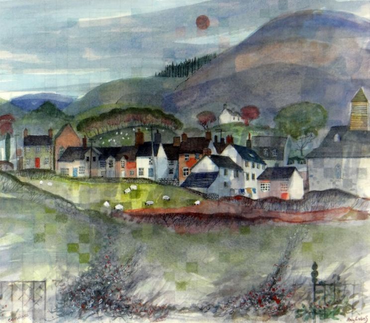 RAY EVANS watercolour - mid Wales village with colourful houses & sheep, entitled verso 'Cemaes, Mid-Wales', signed, 27 x 31cms