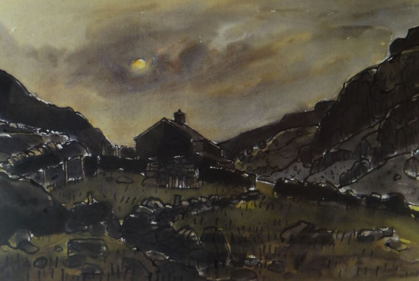 SIR KYFFIN WILLIAMS RA colourwash print - of a hillside farmstead at sunset, signed in full, 36 x 51cms