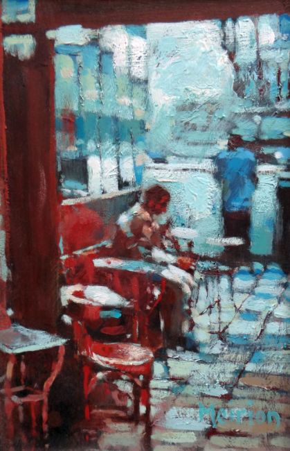 MEIRION JONES acrylic on board - cafe scene with man at counter & man seated, 9 x 19cms