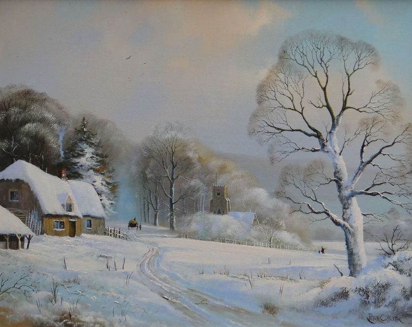 PETER COSSLETT oil on canvas - snowy village scene with horse & cart with church in background, signed, 39 x 49cms