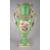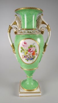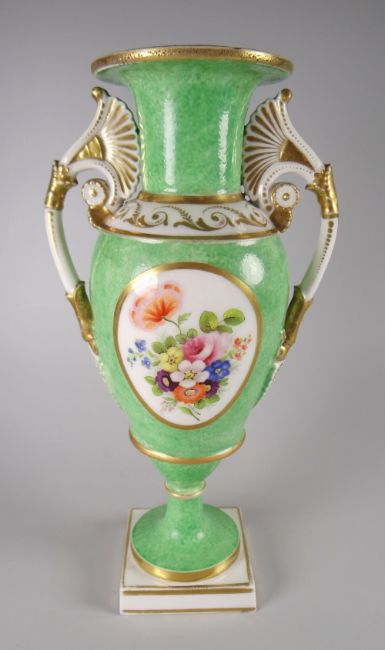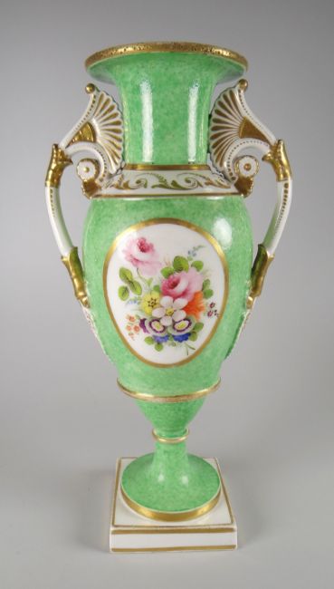 A SWANSEA PORCELAIN VASE with twin handles and of slender ovoid form, flared rim and with a round base to a square platform foot, the handles with lotus flowers and terminating as embossed acanthus leaves above embossed medallions. The body painted possibly by Henry Morris with opposing oval panels of floral sprays to a mottle green reserve, and with fine gilt-work to the shoulders, rim and handles, impressed mark SWANSEA to base, 26cms high