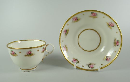A SWANSEA GLASSY PORCELAIN CUP & SAUCER decorated with a series of open pink roses and gilding Condition: no problems apparent