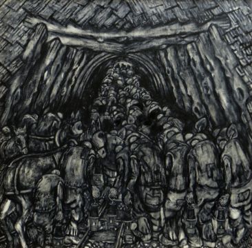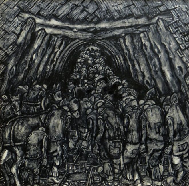 NICK EVANS oil on board - powerful & hypnotic coal mining illustration, depicting a vast number of hunched over miners obediently heading towards the light with ponies & lamps, entitled verso 'All Out - End of Shift', signed & dated 1978, 118 x 118cms
