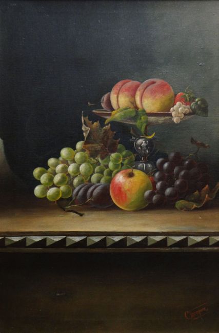 CHARLES THOMPSON oils on canvas, a pair - finely executed still life studies - 1. apples, peaches & grapes on a dish on a table & 2. raspberries, peaches & grapes with glass vase & dish on a table, each signed, 60 x 40cms
