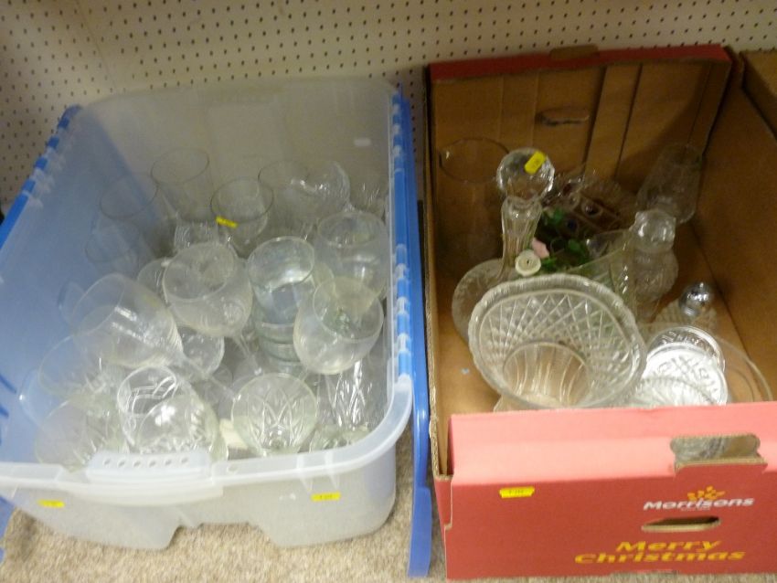 Plastic crate of drinking glassware and another box of glassware including decanter, heavy glass vases etc