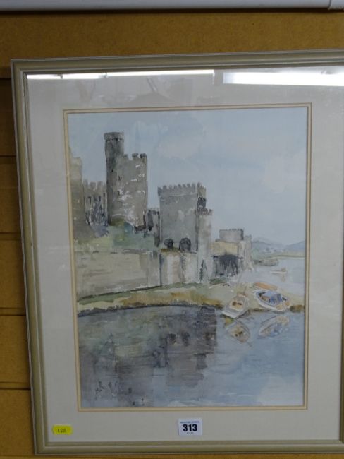 Framed watercolour study of Conwy Castle and Tubular Bridge, initialled 'M W', dated '97