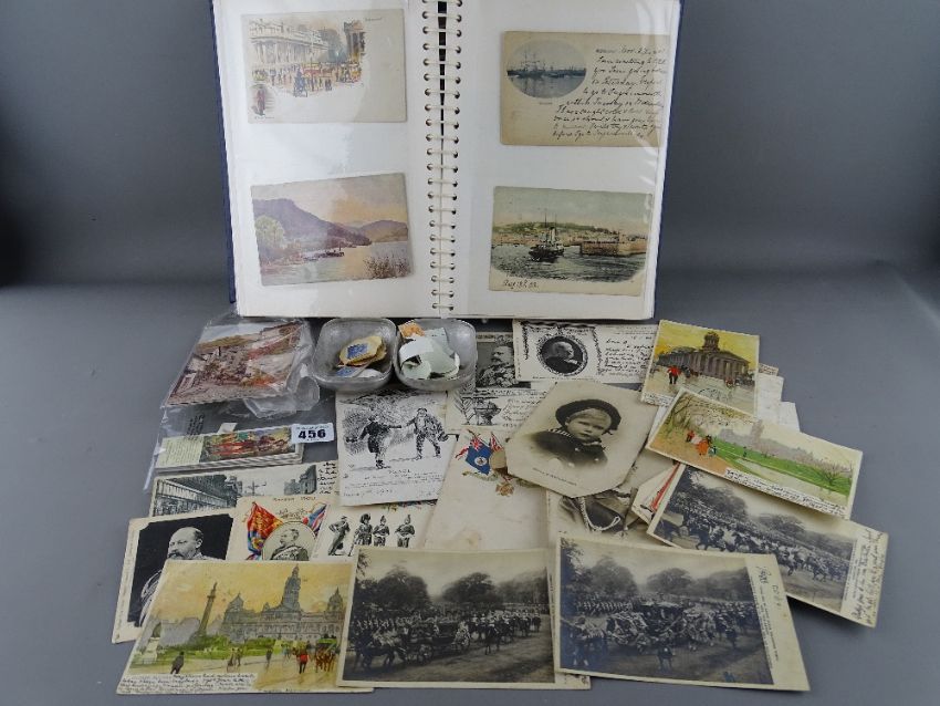 Album of vintage postcards, additional loose cards and an aluminium pocket container of unsorted stamps
