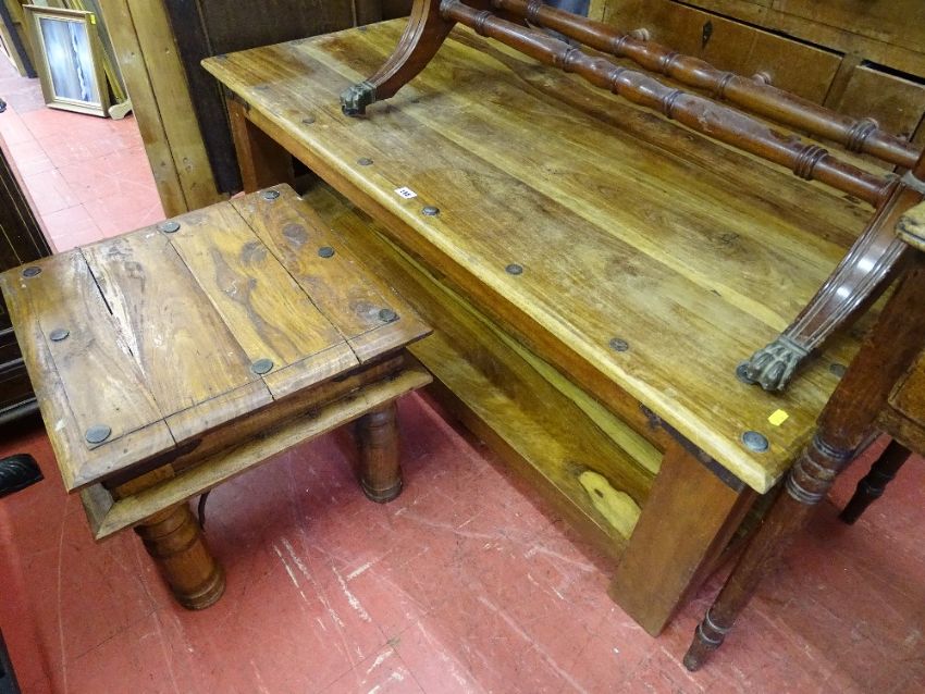 Two tier rustic coffee table and one other small square occasional table with metal corners