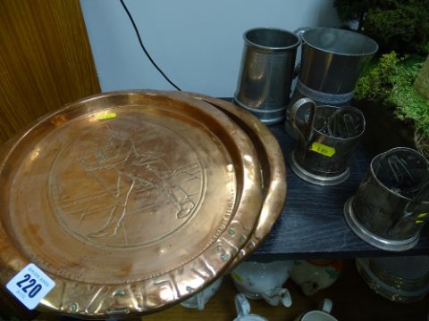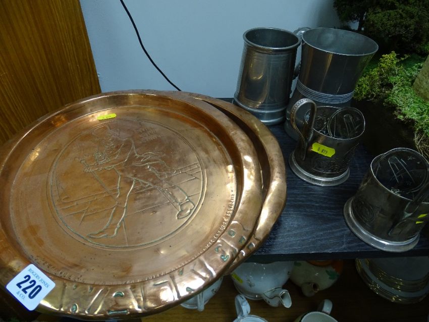 Quantity of white metal and pewter items and a pair of copper trays for Johnnie Walker