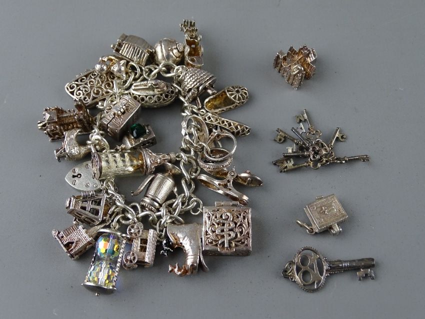Silver charm bracelets with many charms, 3.8 troy ozs