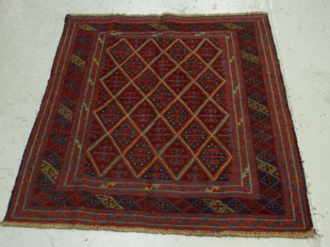 A red & blue patterned Gazak rug, 121 x 113cms