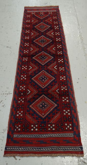 A red & blue patterned Meshwani runner, 254 x 63cms
