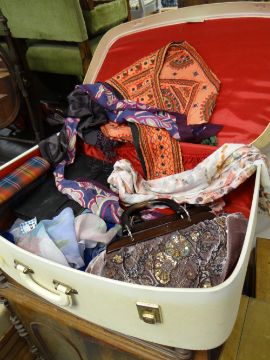 A vintage suitcase & contents including a selection of handbags & scarves