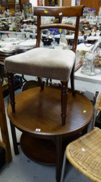 A circular mahogany coffee table with lower shelf & fretwork decoration together with a mahogany hall chair