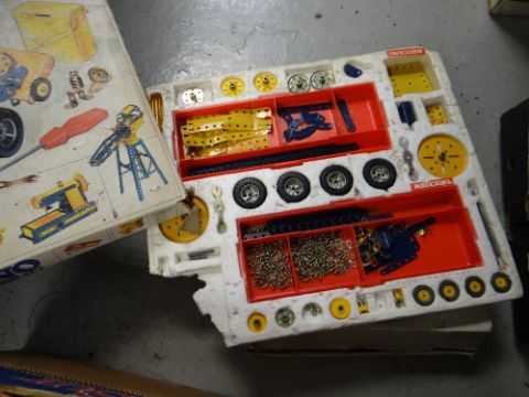 Two boxes containing vintage railway items, boxed Meccano set etc