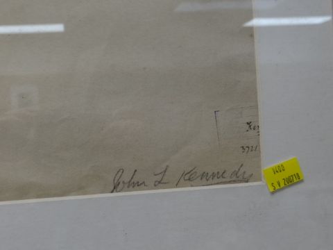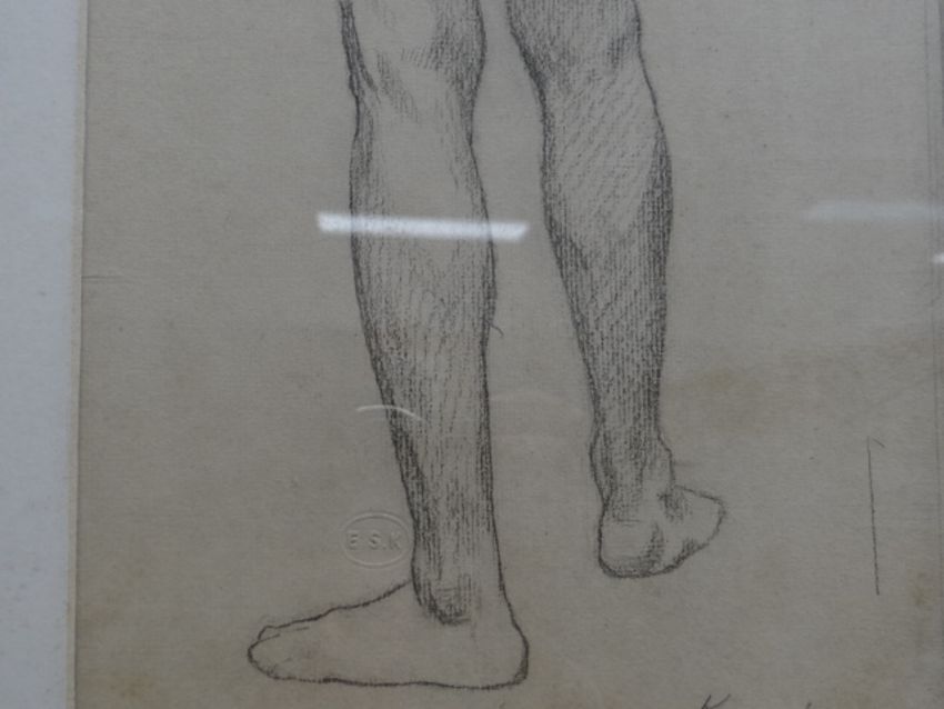 Two framed male nude sketches by JOHN L KENNEDY & on embossed paper with E S K imprintOne of the pictures is heavily creased, the other is two separate picture stuck to one board, again there is creasing. Both pictures are 55 x 37cms Please note that condition reports are always supplied in good faith, however they are subjective and it is always recommended that potential buyers inspect themselves.