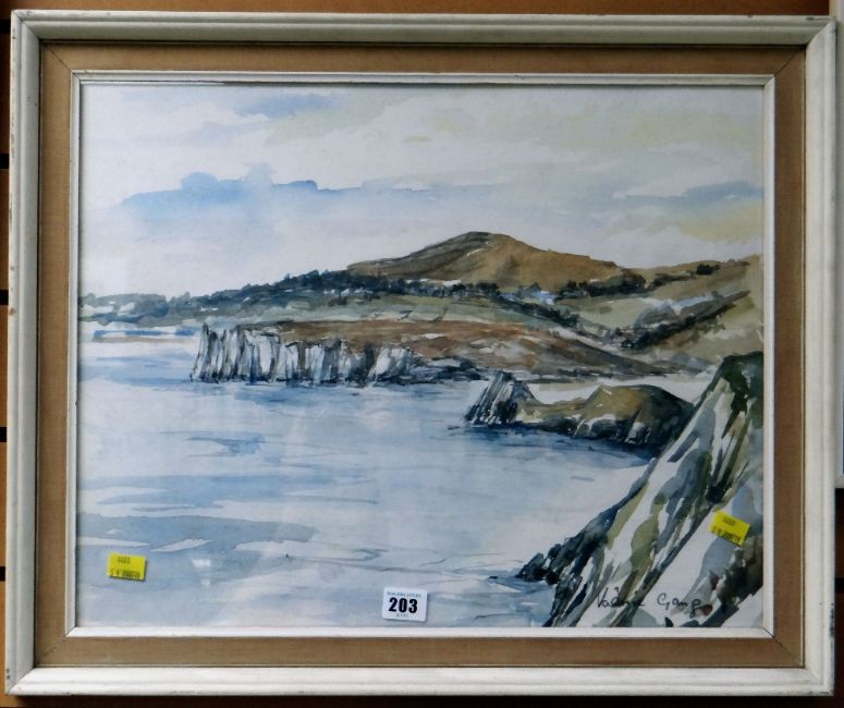 Framed watercolour of Three Cliffs Bay, The Gower by VALERIE GANZ