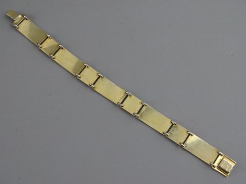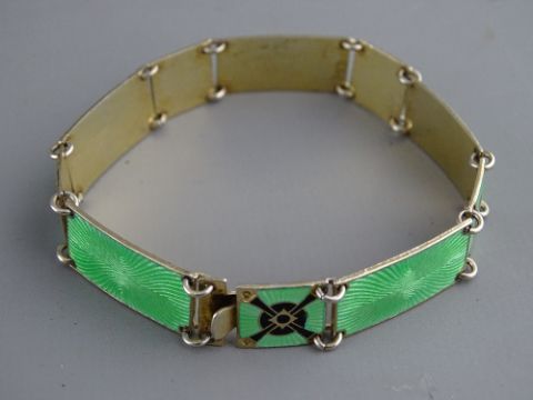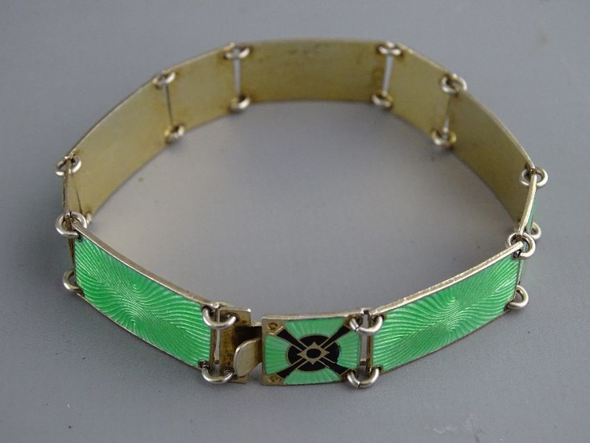 A NORWEGIAN SILVER GILT & GUILLOCHE ENAMEL BRACELET by Kristian Hestenes, square and rectangular ring linked panels in green enamel, the square sections decorated with black enamel and gilt pattern, circa 1950, stamped 'Sterling 925S, Hestenes, Norway', 18.5 cms long