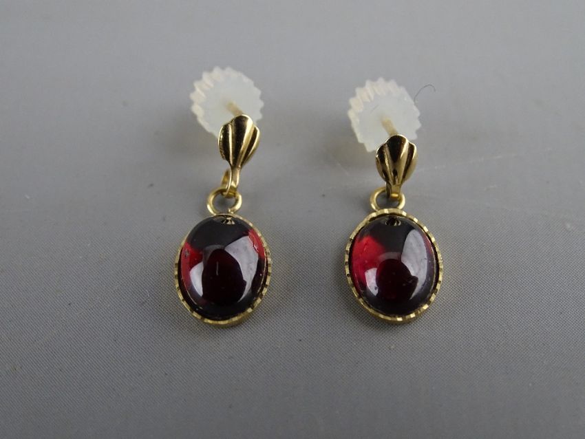 A PAIR OF NINE CARAT GOLD MOUNTED OVAL CABOCHON GARNET EARRINGS, total 1.2 grms