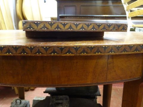 A FRENCH INLAID MAHOGANY EXTENDING DINING TABLE with single additional leaf, on tapering supports with brass castors, 74 cms high, 150 cms long (leaf in), 98.5 cms wide