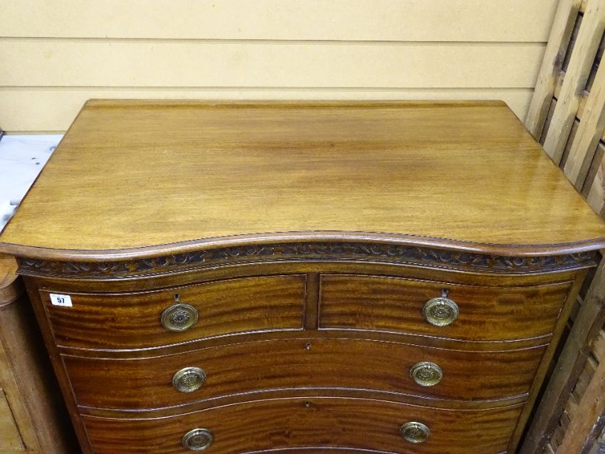 A REGENCY STYLE MAHOGANY SERPENTINE FRONTED CHEST of two short over four long drawers, 114 cms high, 91.5 cms wide, 54 cms deep
