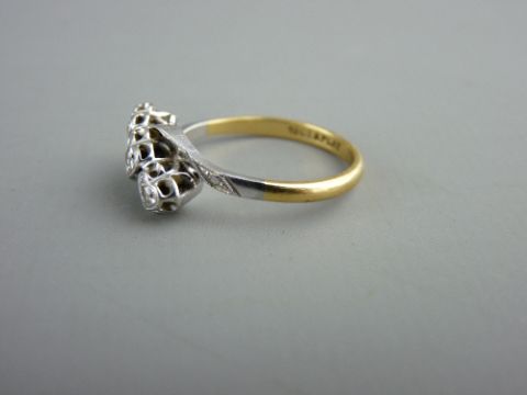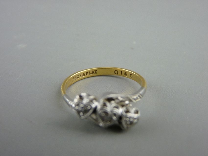 AN EIGHTEEN CARAT GOLD & PLATINUM THREE STONE DIAMOND RING the stones in heart shaped settings, 2.8 grms, size 'M'