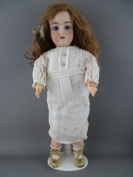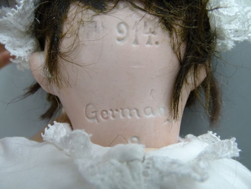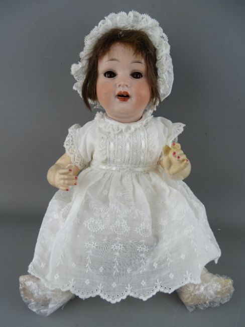 THREE ANTIQUE GERMAN BISQUE HEADED DOLLS including a cloth bodied Armand Marseille no. 3700, marked 'AMS/O DEP', with fixed blue eyes, open mouthed with teeth showing and painted detail, with blonde wig and traditional style clothing, 38 cms long, another numbered 390 stamped 'A0 1/2 M', fixed blue eyes and open mouth with teeth showing and painted detail on a composition and jointed limb body, 40 cms long and a P.M.914 (Porzellanfabrik Mengersgereuth) having open/closing brown eyes with lashes, open mouthed with moulded teeth and tongue showing, on a fixed joint composition body, 33 cms long (porcelain good, small finger loss to the jointed example)