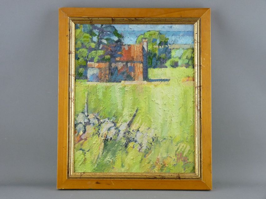 IFOR PRITCHARD (renowned Welsh slate quarry artist) oil on board - rural scene with farmstead, signed, 30 x 24 cms