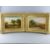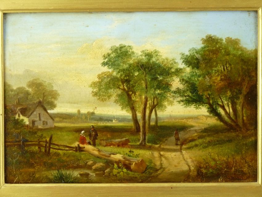 HENRY BRITTAN WILLIS oils on board, a pair - landscapes - 1. pond scene with cattle, figures and distant castle and town (requiring full restoration) and 2. wooded lane with cottage and figures, each indistinctly signed, 21.5 x 32 cms