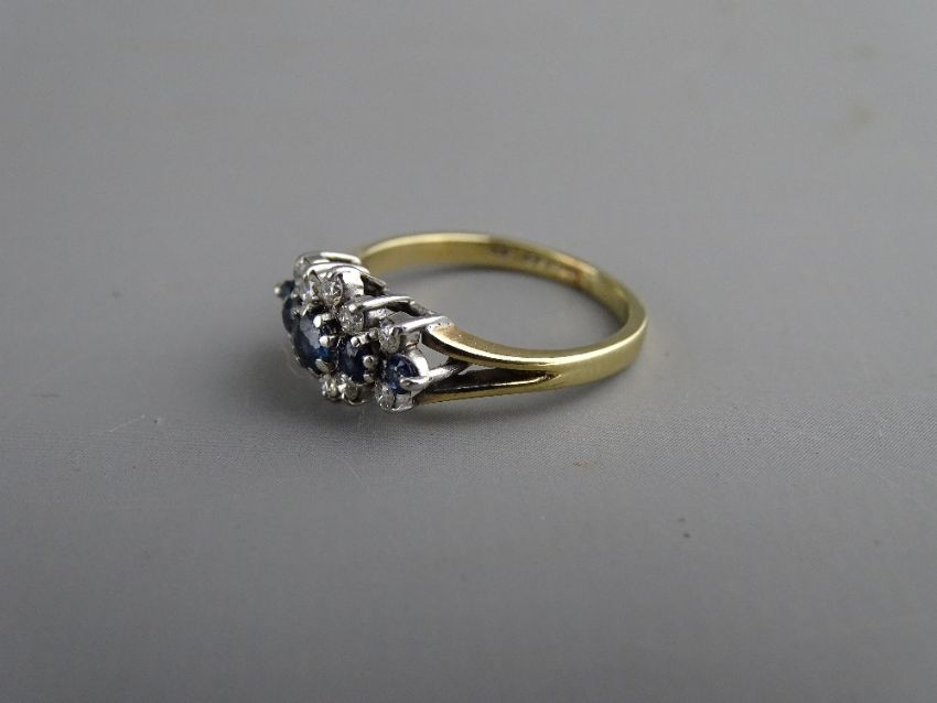 A NINE CARAT GOLD SAPPHIRE & DIAMOND DRESS RING having a centre sapphire with two flanking tiny sapphires and ten (five on each side) tiny diamonds to a split shank, 2.4 grms