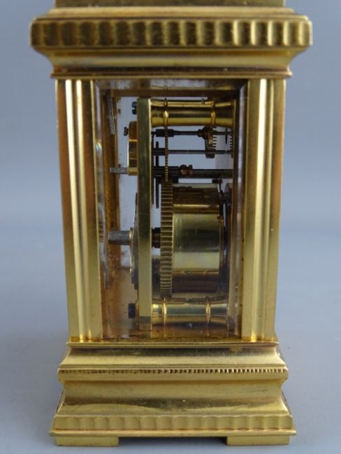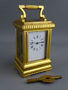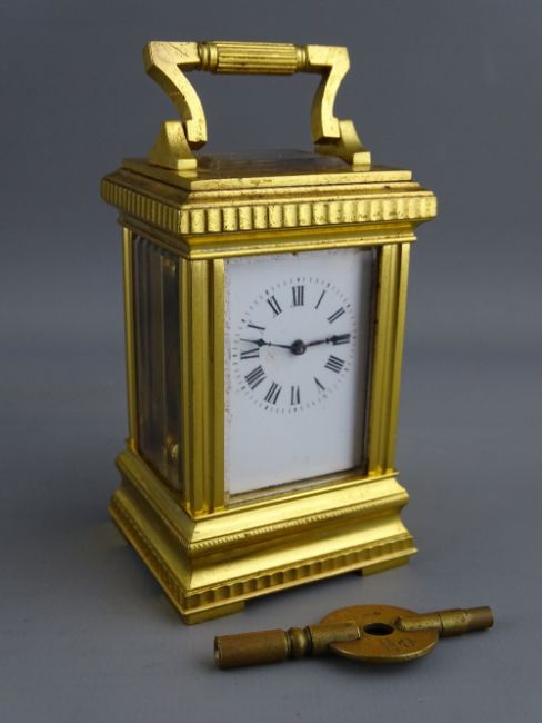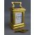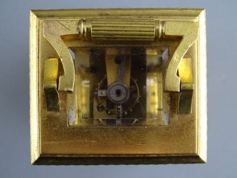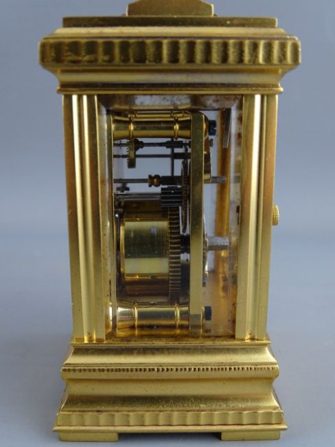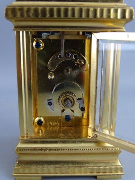 A FRENCH GILT BRASS CASED MINIATURE CARRIAGE CLOCK with white enamel dial set with Roman numerals, the backplate numbered 1494, 10.75 cms high handle up