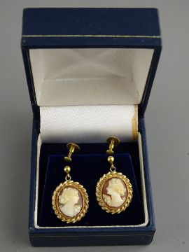 A PAIR OF NINE CARAT GOLD SCREW-FIX CAMEO EARRINGS