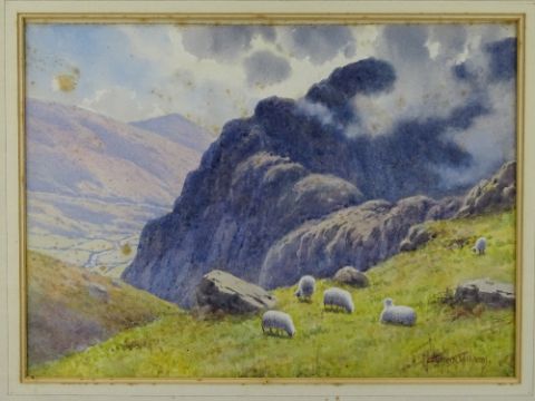 WARREN WILLIAMS ARCA early watercolour - mountainscape with sheep grazing, near Dwygyfylchi, signed, 27 x 37 cms (requiring full restoration)