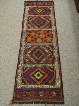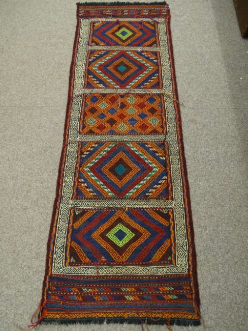 A SUZNI KILIM CARPET RUNNER having colourful double bordered panels, 189 x 63 cms