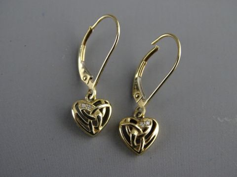 TWO PAIRS OF NINE CARAT GOLD HEART SHAPED EARRINGS in the Celtic style, each with two tiny diamonds, total 3 grms