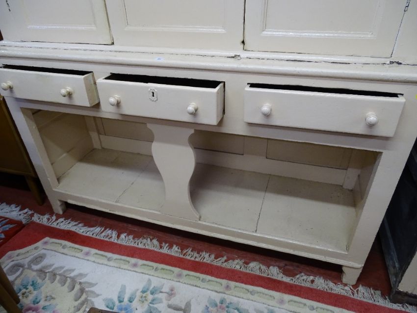 AN INTERESTING CREAM PAINTED PINE HOUSEKEEPER'S CUPBOARD, the upper section having two panelled doors with centre blind panel, the upper panel of each having heart shaped food ventilation holes to a base of three top drawers and a potboard floor, 209 cms high, 167 cms wide, 49.5 cms deep