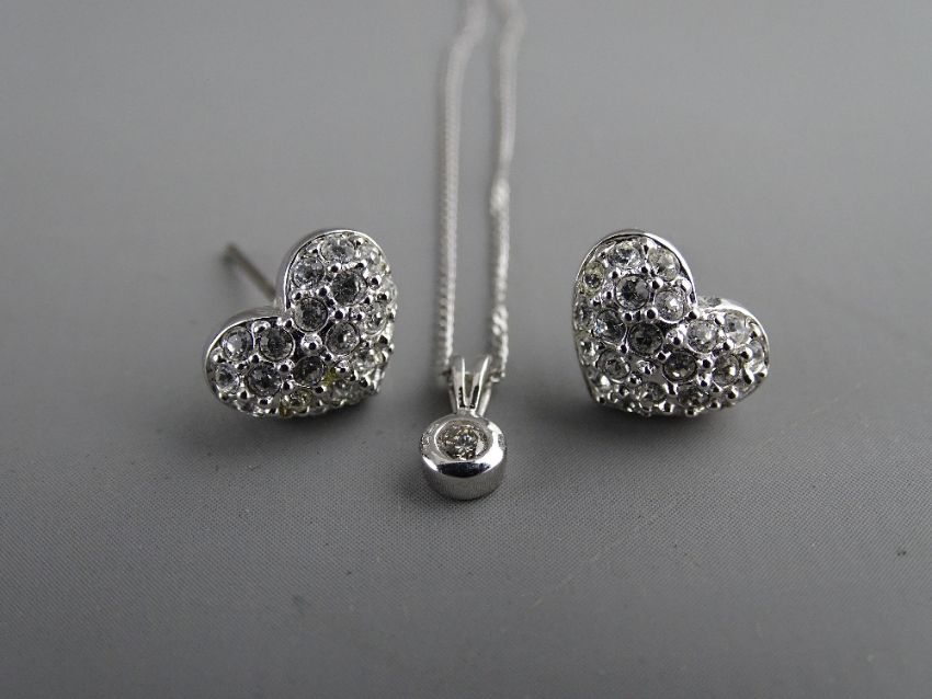 A PAIR OF SWAROVSKI HEART SHAPED EARRINGS, clustered overall with tiny czs and a fine link silver neck chain with tiny round cut diamond pendant, total 1 grm