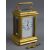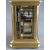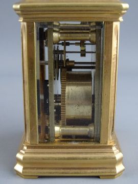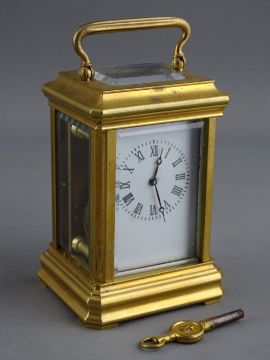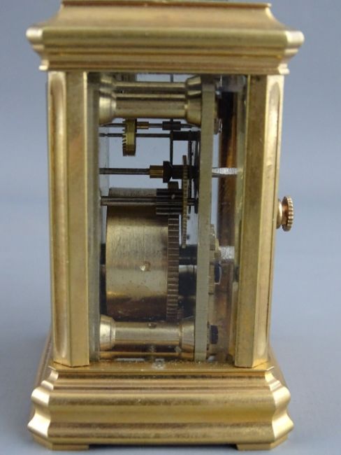 A FRENCH MINIATURE BRASS CASED CARRIAGE CLOCK having a white enamel dial set with Roman numerals, the backplate numbered 3012, 9 cms high handle up, with no. 7 watch winding key