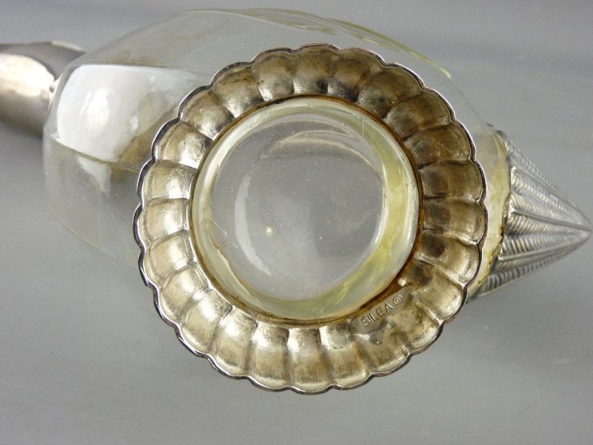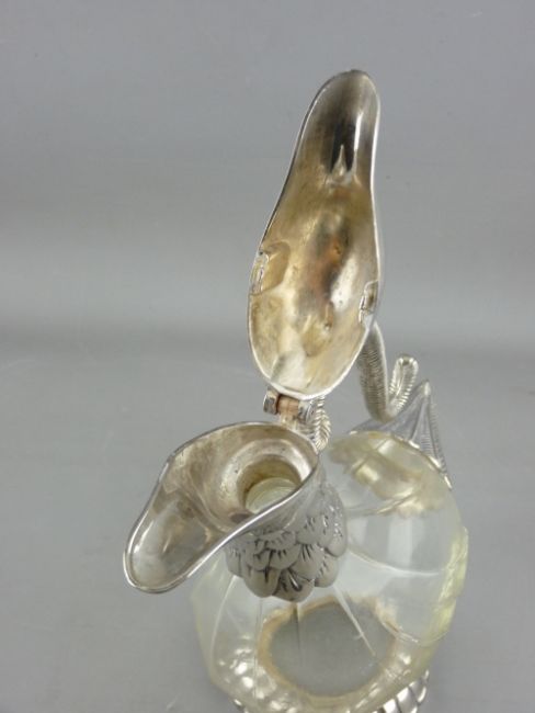A DUCK SHAPED CLARET JUG with plated metal mounts, 25 cms high